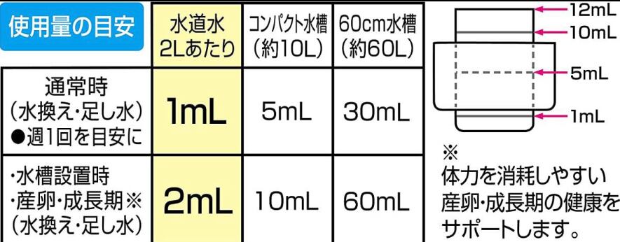 産卵・成長に適した水に!! 産卵数アップ!産卵サポート成分キトサン配合! ビタミン・ミネラルプラスカルキぬき+重金属無害化で稚魚も守る水に。 [自然界のメダカの生息環境に近づけて産卵・成長に適した水に]●水道水中の有害な塩素と重金属を瞬間無害化。さらにキトサン(天然由来成分)がメダカの産卵・成長をサポート。産卵数約6倍(ジェックスラボ調べ)また、通常のカルキぬきに比べて116%の成長率!※通常のカルキぬき使用の水槽での成長率を100%とした場合(ジェックスラボ調べ) ●稚魚の成長と健康維持のためにビタミン・ミネラルを配合しました。 ●小さな水槽でも使いやすい、便利な計量キャップ付き。 <使用量の目安>通常時(水換え・足し水)・週1回を目安に水道水2Lあたり1mL、水槽設置時・産卵・成長期※体力を消耗しやすい産卵。成長期の健康をサポートします。水道水2Lあたり2mL <ご使用方法>●;使用量の目安を参考に、水道水、くみ置きの水に本製品を入れ、軽くかき混ぜてご使用ください。入れてすぐにご使用いただけます。●メダカだけでなく、その他の観賞魚にもご使用いただけます。 内容量: 500mL たっぷり使える飼育水1000L分(※通常使用時)